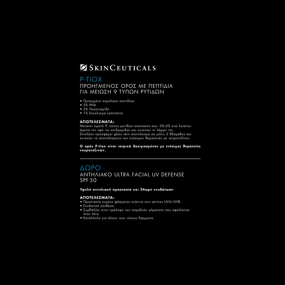 Το P-TIOX είναι ένας προηγμένος αντιρυτιδικός ορός με πεπτίδια που έχει αποδειχθεί κλινικά ότι μειώνει την όψη 9 τύπων ρυτίδων έως 20,6%. Ο ορός αυτός απαλύνει τις ρυτίδες χάρη σε ένα Προηγμένο Σύμπλοκο Πεπτιδίων (εξαπεπτίδια και διπεπτίδια), εμπνευσμένο από τη δράση των ενέσιμων νευροτοξινών, για μείωση των κύριων ρυτίδων σύσπασης. Αυτή η πρωτοποριακή σύνθεση πεπτιδίων είναι εμπλουτισμένη με επιπλέον ισχυρά συστατικά: 5% PHA, 5% Νιασιναμίδη και εκχύλισμα Laminaria, για να βελτιώνει την υφή και της λάμψης της επιδερμίδας σε 1 εβδομάδα και να μεγιστοποιεί τα ορατά αποτελέσματα αντιγήρανσης. Το P-TIOX είναι ιατρικά δοκιμασμένο σε συνδυασμό με ενέσιμες θεραπείες νευροτοξίνης και αποδεδειγμένο ότι συμπληρώνει τα αντιρυτιδικά αποτελέσματα σε όλες τις περιοχές του προσώπου – ακόμα και σε εκείνες που είναι δύσκολο να δεχθούν ενέσιμη θεραπεία – και βελτιώνει την ποιότητα της επιφάνειας της επιδερμίδας. Όταν συνδυάζεται με ενέσεις νευροτοξίνης, το P-TIOX εξασφαλίζει ορατή διόρθωση των σημαδιών γήρανσης, με άμεσα και μακράς διάρκειας αποτελέσματα, ακόμα και μετά από 3 μήνες.